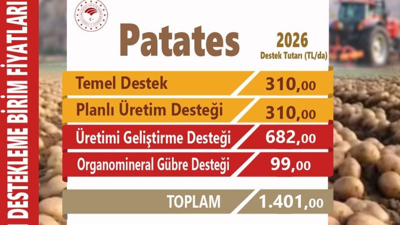 Patates üreticisinin merakla beklediği 2026 destek rakamları açıklandı. Tarım ve Orman Bakanlığı tarafından duyurulan yeni birim fiyatlara göre, Nevşehir’de şartları sağlayan çiftçilere dekar başına toplam 1.401 TL ödeme yapılacak.